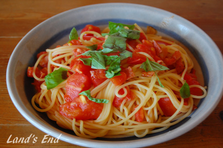 ベーコンと一緒に炒めて作ったトマトパスタ、バジル添え。
