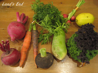写真中央下の黒いのは「黒丸大根」。右のほうのわさわさしたのはケールです。